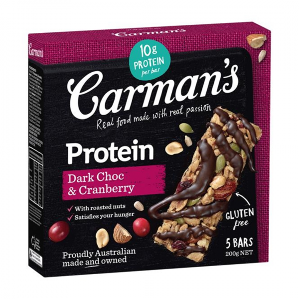 Thanh Năng Lượng Socola Đắng & Nam Việt Quất, Protein, Dark Choc & Cranberry, 5 Thanh (200g) - CARMAN'S